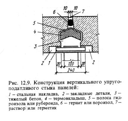 достаточной прочностью. По расположению стыки различают вертикальные и горизонтальные. Вертикальные стыки по способу связей панелей между собой разделяют на упругоподатливые и жесткие. При устройстве упругоподатливого стыка панели соединяются с помощью стальных связей, привариваемых к закладным деталям стыкуемых элементов.