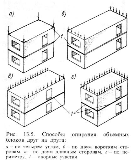 По массе и размерам обьемные блоки делятся на три группы: мелкие, средней величины, крупноразмерные. Применяют следующие способы опирания обьемных блоков: по четырем углам, по двум коротким сторонам, по двум длинным сторонам, по периметру.