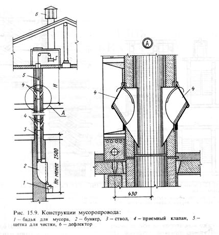 Состоит мусоропровод из вертикального ствола, имеющего приемные камеры на каждом этаже, вытяжных труб и мусоросборного бункера, размещаемого в камере.