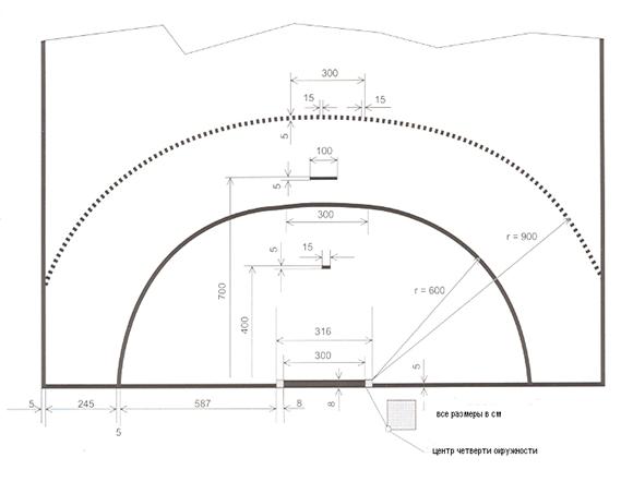 Площадь ворот ограничивается линией площади ворот, которая проводится следующим образом: параллельно (наружной) линии ворот в 6м от нее крепится лента или веревка.