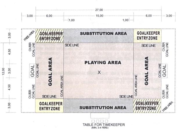f) Игровая площадка должна быть окружена зоной безопасности, которая составляет не менее 1 м шириной вдоль боковых линий и не менее 2 м шириной за внешними линиями ворот.