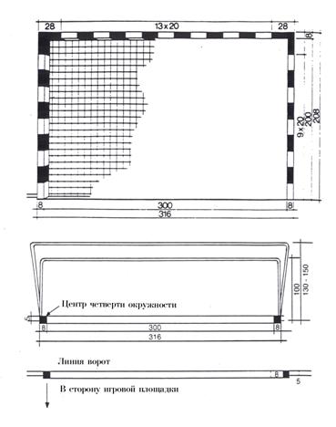 Размеры окрашенных в один цвет полосок в местах соединений стоек и перекладены составляют по 28 см в разные стороны. Длина всех других окрашенных полосок составляет 20 см. Ворота должны иметь сетку, называемую сеткой ворот, которая предназначена для того, чтобы мяч, брошенный в ворота, не мог сразу же отскочить обратно или пролететь через ворота. В случае необходимости используется дополнительная сетка (гаситель), которая закрепляется за линией ворот. Расстояние между линией ворот и дополнительной сеткой должно быть приблизительно 70 см, но не менее 60 см.