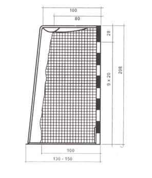 h) Глубина сетки ворот должна составлять вверху 0,9м от внешней кромки линии ворот, у основания 1,1м, при допуске этих размеров +/- 0,1м. Размеры крепежных угольников не должны быть более 10 х 10см. Сетка должна крепиться к стойкам и перекладины, по крайней мере, через каждые 20см. Разрешается крепить сетку ворот и гаситель вместе, но таким образом, чтобы мяч не смог попасть между ними.