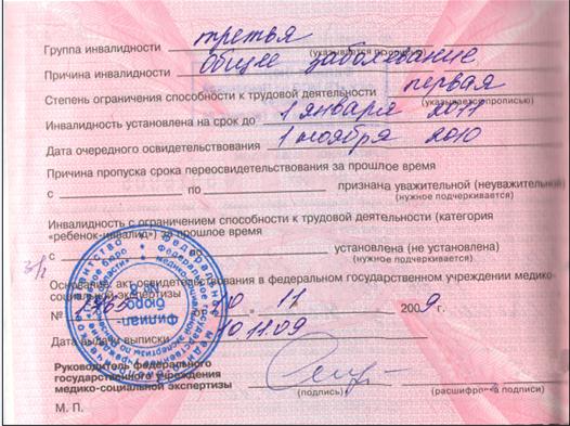 ü Причина инвалидности. В справке МСЭ причины инвалидности указываются в соответствии с формулировками, которые строго поименованы соответствующими правилами, утвержденными Минздравом России. Таких причин предусмотрено достаточно много (мы перечислили их в Приложении 1). В отдельных случаях причина инвалидности влияет на размер трудовых, государственных и социальных пенсий. Поскольку самой распространенной причиной инвалидности является «общее заболевание», в наших дальнейших разъяснениях мы будем вести речь о тех лицах, которые признаны инвалидами вследствие общего заболевания.