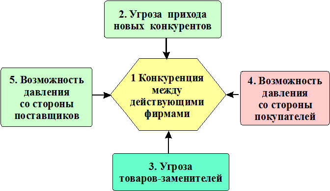 Согласно исследованиям М. Портера состояние конкурентной среды на рынке характеризуется пятью силами (рис. 23):