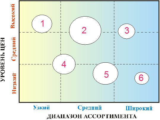 1.Установить весь диапазон характеристик, отличающих компании друг от друга. Наиболее типичные различия между фирмами одной отрасли: соотношение «цена - уровень качества» (высокий, средний, низкий), географическое распределение (локальное, региональное, национальное, глобальное), степень вертикальной интеграции (отсутствие, частичная, полная), использование распределительных каналов (один, несколько, много), Степень предоставляемых услуг (без услуг, ограниченные услуги, полный сервис).