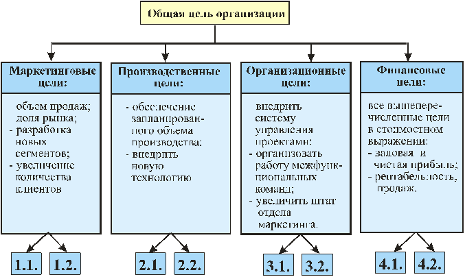 На практике часто используют следующий вид «дерева» целей: цель организации – цели бизнесов – функциональные цели подразделений – оперативные цели.