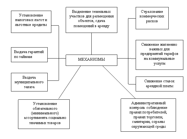Поскольку потребительский рынок в настоящее время почти полностью находится в руках частного сектора, муниципальная власть не может устанавливать ни объемы поставок, ни привязку потребителей к поставщикам, ни цены на важнейшие продовольственные и непродовольственные товары. Но она может использовать формы и методы косвенного финансово-экономического регулирования, а также меры административного воздействия на основе муниципальных нормативно-правовых актов.