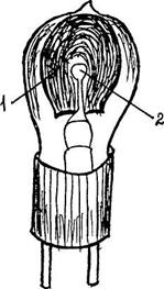 Устройство фотоэлемента показано на рис. 10. В стеклянном герметически закрытом баллоне расположены два электрода – катод 1 и анод 2. Фотокатод выполняется путем нанесения светочувствительного материала на внутренней поверхности стеклянной колбы фотоэлемента так, чтобы светочувствительный слой был обращен внутрь колбы. В качестве светочувствительного материала чаще всего применяется цезий. Анод фотоэлемента выполняется в виде небольшого кольца (или сетки), которое укрепляется на ножке в цоколе. При такой форме анод не мешает лучам света попадать на катод.