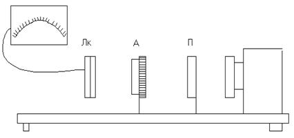 Люксметр (Лк) укрепить на штативе. Установить шкалу анализатора А на нуль и поворотом поляризатора П добиться максимальной освещенности Е. Поворачивая анализатор с шагом