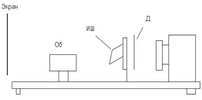 В держателе с диском Д револьверного типа, имеющем круглые диафрагмы различных радиусов, закрепить кристалл исландского шпата ИШ. Установить диафрагму с наименьшим радиусом (≈0,5 мм). Объектив поставить как можно правее (по рисунку) и, перемещая держатель с ИШ, получить четкое изображение на экране. Затем, удерживая рукой держатель с ИШ (чтобы изображение на экране не «дергалось»), плавно вращать окошко с ИШ. Сделать вывод.