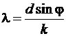 В работе длина волны излучения определяется с помощью дифракционной решетки с известным периодом. Если падающий луч длинной волны излучения l, перпендикулярен поверхности решетки, период которой равен d, то угол j и порядок k дифракции связаны соотношением: