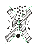 3-я фаза – в момент встречи выдавленного из отверстия матрицы столбика с неподвижным ножом происходит отделение готовой гранулы от оставшегося в отверстии корма.