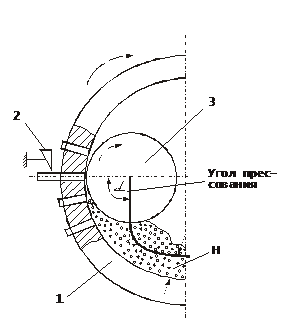 Рис.13.5. Процесс образования гранул в кольцевой матрице гранулятора 1 - матрица; 2 - нож; 3 - прессующий валец. | Рис.13.6. Изменение нормального давления |