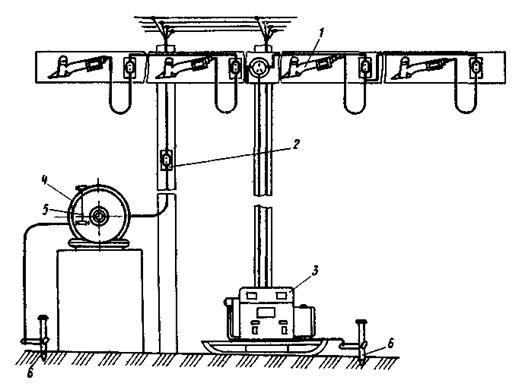 Рис.18.2. Схема размещения оборудования стригального пункта с агрегатом ЭСА-12/200: 1 – стригальная машинка МС-200; 2 – выключатель; 3 – преобразователь частоты тока ИЭ-9401; 4 – заточный аппарат ТА-1; 5 – тяга с державкой; 6 – заземление. |