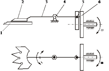 Эксцентриковый механизм преобразовывает вращательные движения передаточного вала в колебательные (возвратно-поступательные) движения ножа по гребенке. Ролик 5 эксцентрика 6 входит в вертикальный паз рычага 3 и при своем вращении заставляет колебаться (качаться) рычаг 3 в горизонтальной плоскости около центра вращения 4.