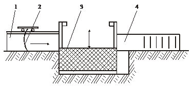 Рис.18.8 Технологическая схема погружной механизированной установки типа МКУ-1: 1 - загон для не купанных овец; 2 - передвижное ограждение с пальцами – толкателями; 3 - погружная платформа; 4 - загон для купанных овец. |