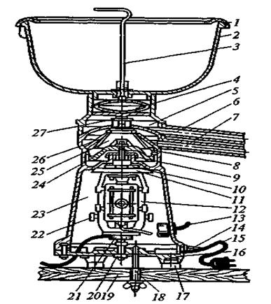 Рис.23.2. Сепаратор - сливкоотделитель с электроприводом: 1 - отражатель; 2, 6 и 7 - приемники молока, сливок и обрата; 3 - кран с ручкой; 4 - поплавок; 5 - поплавковая камера; 8 - барабан; 9 - муфта; 10 и 21 - верхняя и нижняя опоры; 11 - щиток; 12 - электродвигатель; 13 - выключатель; 14 ~ втулка; 15 - шнур с вилкой; 16 - основание; 17 - амортизатор; 18 - фиксатор; 19 - доска; 20 - подпятник с контргайкой; 22 - щетка; 23 - сепаратор; 24 - основание барабана; 25 - тарелка; 26 - крышка барабана; 27 - зажимная гайка |
