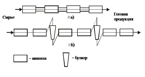 Рис.9.1. Схемы поточно-технологических линий: а – с жесткой связью, б – с гибкой связью. |