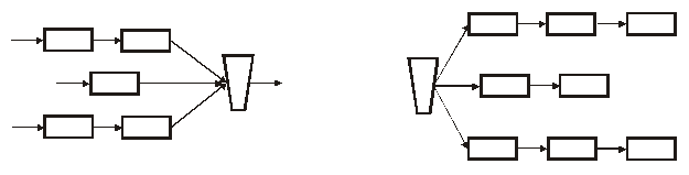 Рис 9.2. Схемы поточно-технологических линий: а - со сходящимися потоками, б - с параллельным соединением. |