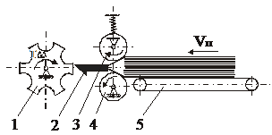1 - режущий аппарат; 2 - противорежущая пластина; 3 - верхний уплотнительный валец; 4 - нижний уплотнительный валец; 5 - питающий транспортер.