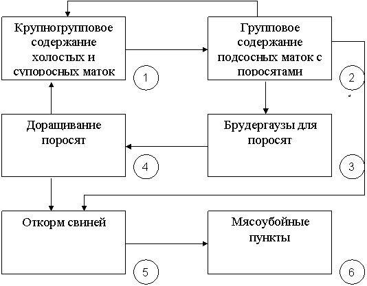Маточное поголовье свиней до опороса содержат крупными группами (250-500 гол.) в свинарниках 1. Перед опоросом свиноматок переводят в помещение 2, где после опороса их с поросятами размещают в индивидуальных, а через 7-10 дней – в групповых станках. Через 10-14 суток поросят отнимают от маток и размещают в брудергаузах 3 группами по 100 голов. В 2-х месячном возрасте поросят направляют на доращивание в помещение 4, а затем на откорм. Наиболее высоко-породных свиней из помещения 4 переводят для пополнения основного стада в помещении 1. Выбракованных свиноматок после откорма в помещении 5 направляют на убой.
