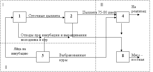 В технологию производства мясных цыплят (бройлеров) входит: содержание маточного стада в птичниках 5 на глубокой подстилке, инкубация яиц в инкубатории 1 и выращивание цыплят в широкогабаритных птичниках 2. За 70-80 дней цыплята достигают 1,2 -1,5 кг и поступают на убой.