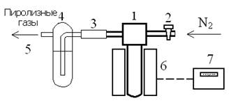 Рисунок 1 – Экспериментальная установка 1 - реактор, 2-вентиль; 3 пробоотборник; 4 – гидрозатвор; 5 –газ к эвдиометру; 6 –электропечь; 7 – автоматический регулятор температуры |