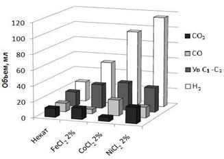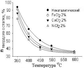 В случае использования катализаторов существенное снижение массы твердого остатка и увеличение массы газообразных и жидких продуктов наблюдалось в интервале ºС, при дальнейшем увеличении температуры процесса массовое распределение продуктов изменялось незначительно, в отличии от некаталитического процесса при котором массовое распределение продуктов изменялось на протяжении всего исследованного интервала температур. При использовании всех исследуемых хлоридов металлов подгруппы железа в качестве катализаторов процесса пиролиза наблюдалось увеличение скорости образования и объема газообразных продуктов, причем по степени влияния хлоридов металлов подгруппы железа данные характеристики исследуемые соли соответствуют ряду: