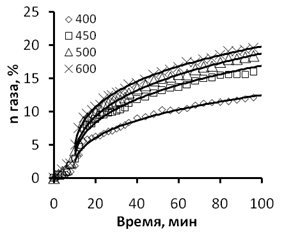 Эти уравнения описывают кинетику выделения газообразных продуктов пиролиза, поэтому не претендуют на отражение процесса пиролиза полимерного корда в целом.