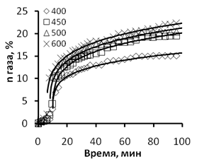 Таблица 2 – Кинетические параметры процесса образования газообразных продуктов при пиролизе полимерного корда в интервале температур °С