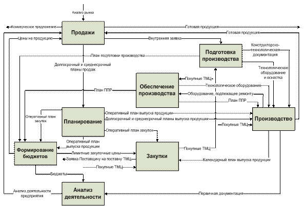 Пятая глава посвящена внедрению разработанной проектно-производственной интегрированной системной модели, системы управления ЕИП, системы конфигурирования бизнес-процессов и структуры ТП на Сызранском предприятии тяжелого машиностроения . Предложена методика внедрения, а также подробно описана сама процедура. На основе системного анализа информационных потоков разработана функциональная системная модель основной деятельности предприятия (рис. 11), проведен анализ деятельности конструкторов и технологов, их взаимодействия, этапов конструкторского проектирования с использованием систем PDM SMARTEAM и CAD/CAM/CAE CATIA.