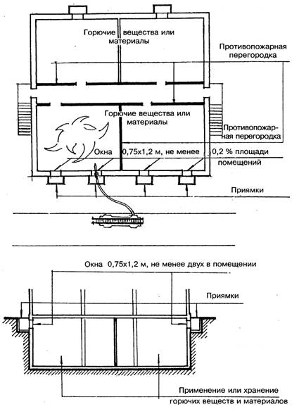 В помещениях, расположенных в пределах противопожарной зоны, не допускается применять или хранить горючие газы, жидкости и материалы, а также предусматривать процессы, связанные с образованием горючих пылей (рис. 9).
