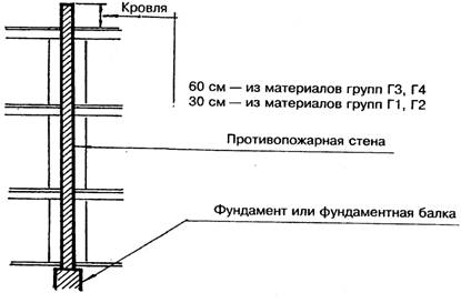 4.1.6. Противопожарные стены должны возвышаться над кровлей: не менее чем на 60 см, если хотя бы один из элементов чердачного или бесчердачного покрытия, за исключением кровли, выполнен из материалов групп ГЗ, Г4; не менее чем на 30 см, если элементы чердачного или бесчердачного покрытия, за исключением кровли, выполнены из материалов групп Г1, Г2 (рис.5).