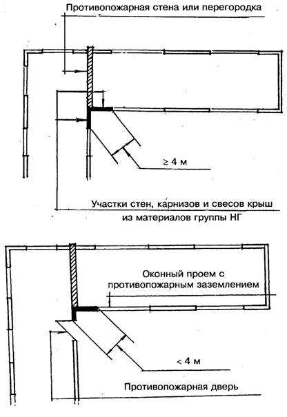 4.1.9. При размещении противопожарных стен или противопожарных перегородок в местах примыкания одной части здания к другой под углом необходимо, чтобы расстояние по горизонтали между ближайшими гранями проемов, расположенных в наружных стенах, было не менее 4 м, а участки стен, карнизов и свесов крыш, примыкающие к противопожарной стене или перегородке под углом, на длине не менее 4 м были выполнены из материалов группы НГ. При расстоянии между указанными проемами менее 4 м они должны заполняться противопожарными дверями или окнами 1-го типа (рис. 6).