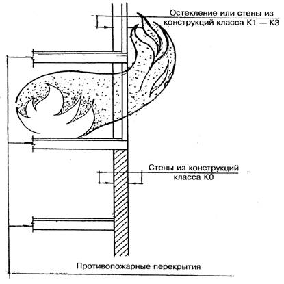 4.2.1.Противопожарные перекрытия должны примыкать к наружным стенам, выполненным из материалов группы НГ, без зазоров. Противопожарные перекрытия в зданиях с наружными стенами классов К1, К2 и КЗ или с остеклением, расположенным в уровне перекрытия, должны пересекать эти стены и остекление (рис. 8). В местах пересечения целесообразно устраивать гребни, выступы или козырьки, предотвращающие переход пламени или продуктов горения через оконные проемы.