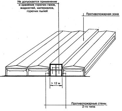 Противопожарная зона выполняется в виде вставки, разделяющей здание по всей ширине (длине) и высоте. Вставка представляет собой часть здания, образованную противопожарными стенами 2-го типа, которые отделяют вставку от пожарных отсеков. Ширина зоны должна быть не менее 12м.