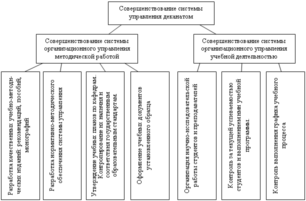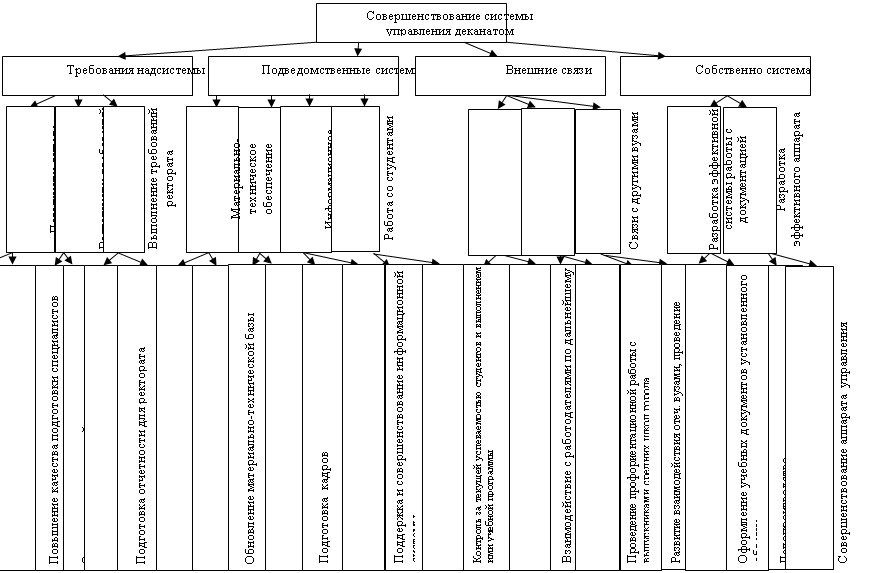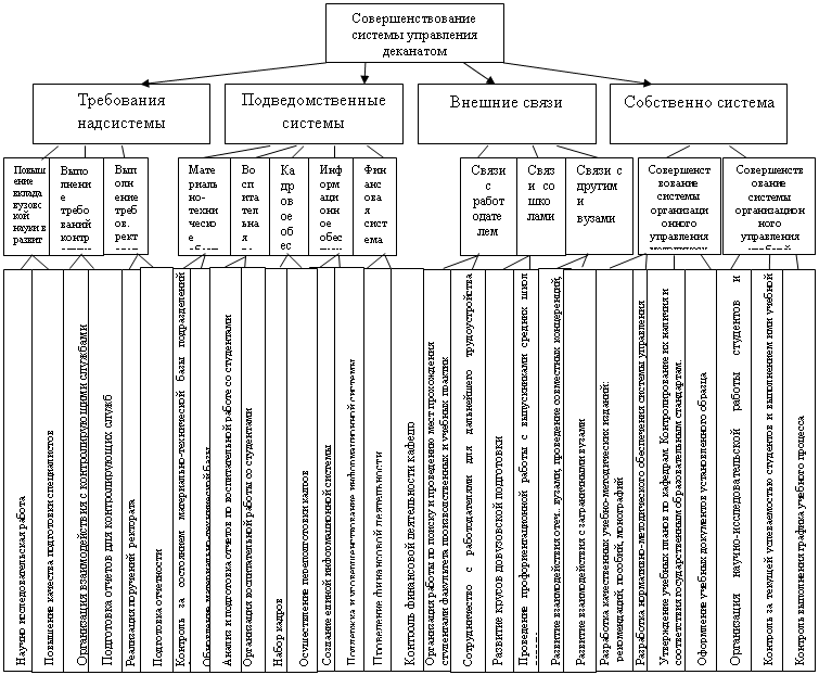 Понятие деятельности в той или иной форме используется в любой методике структуризации, сравнительный анализ, разрабатываемый для отображения и анализа организационных систем управления. В то же время есть методики, в которых концепция деятельности является основой формирования структур целей, т. е. используется на верхних уровнях структуры. Структура целей и функций деканата ФЭМ СПбГПУ, построенная в соответствии с концепцией деятельности, представлена на рис 2.3.