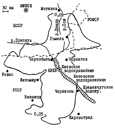 Рис.9. Схема загрязненной территории в районе Чернобыльской АЭС: 0.05 - условная граница загрязненной территории.