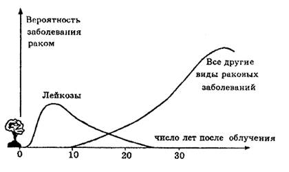 Исследования, охватившие примерно 100000 человек, переживших атомные бомбардировки Хиросимы и Нагасаки, показывают, что рак - наиболее серьезное последствие облучения человека при малых дозах. Первыми среди раковых заболеваний, поражающих население, стоят лейкозы (рис. 12).