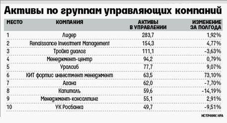 Несмотря на положительные итоги квартала, итоги полугодия гораздо менее позитивные: «Тройка диалог» потеряла 3,63%, «Агана» — 7,7%, а УК «Капиталъ», активы которой за II квартал выросли на 1,5%, по итогам полугодия недосчиталась 14,9%. По словам гендиректора УК «Капиталъ» Вадима Соскова, снижение объясняется реструктуризацией, в результате которой из компании ушли кэптивные деньги. «Хотя прирост в последнем квартале незначителен, но повысилось именно количество клиентских, рыночных денег, так что мы считаем работу в целом успешной», — говорит Сосков.