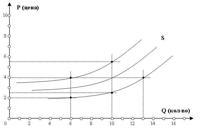 Как видоизменяется график предложения при увеличении предложения товаров (услуг) на рынке?
