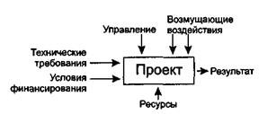 В системном плане проект может быть представлен «черным ящиком», входом котopoгo являются технические требования и условия финансирования, а итогом работы — достижение требуемого результата (рис. 2.1). Выполнение работ обеспечивается наличием необходимых ресурсов: