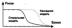 · уменьшение уровня рисков. Данное преимущество является следствием предыдущего, так как риски обнаруживаются именно во время интеграции. Поэтому уровень рисков максимален в начале разработки проекта. По мере продвижения разработки ожидаемый риск уменьшается. Данное утверждение справедливо при любой модели разработки, однако при использовании спиральной модели уменьшение уровня рисков происходит с наибольшей скоростью. Это связано с тем, что при итерационном подходе интеграция выполняется уже на первой итерации и при выполнении начальных итераций выявляются многие аспекты проекта, такие как пригодность используемых инструментальных средств и программного обеспечения, квалификация разработчиков и т. п. На рис. 2.5 приведены в сравнении графики зависимости уровня рисков от времени разработки при использовании каскадного и итерационного подходов;
