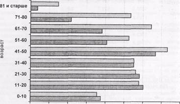Численность мужчин и женщин по возрастным группам в населении Тульского региона (на 1 января 2002 г., человек)