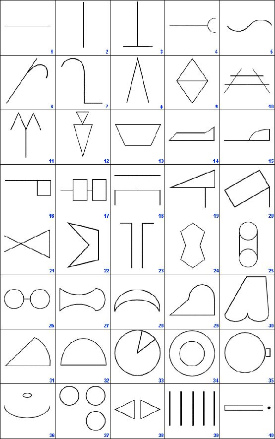"Простые рисунки" Такие рисунки состоят из контуров геометрических фигур, дуг и прямых. В них при создании не закладывается никакого определенного значения. Простые рисунки нужно разгадывать, то есть находить в них смысл, отвечать на вопрос "Что это такое?". Правила игры просты: нужно сказать, что за предмет изображен на рисунке. Чем больше решений, тем лучше. Единственное ограничение: не нужно поворачивать рисунки. Мы предлагаем вам для игры 40 простых рисунков.