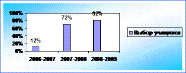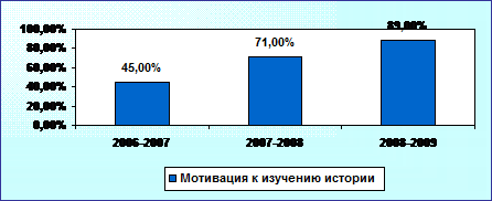 Как видно из таблицы 1.5. результаты анкетирования показывают устойчивый и повышенный интерес к предмету. Приведу наглядный пример – в диаграмме 1.6. представлена положительная динамика мотивации изучения истории в 11 классе. Мотивация учащихся отслеживались с 2006 года, что позволяло мне оценивать и контролировать свою деятельность, как учителя – предметника.