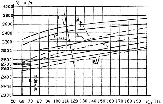 Рис. 8. Средний расход наружного воздуха, кг/ч, для верхней зоны здания из 5 или 13 этажей с внутренним переходом в нижнюю зону в зависимости от давления воздуха в лифтовой шахте на 1-м этаже Рш1, и давления в верхней зоне на верхнем этаже Рк. вз. в равном для кривой 1 — 220, 2 — 180, 3 — 150, 4 — 90 и 5 — 60 Па