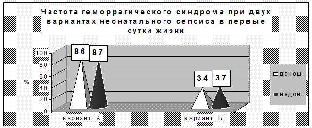Особо хотелось бы подчеркнуть факт наличия геморрагических расстройств уже в первые сутки жизни у 86-87% детей с вариантом А. Гематомный характер кровоточивости – одна из причин снижения ОЦК в данной группе детей (см. рис.№2).