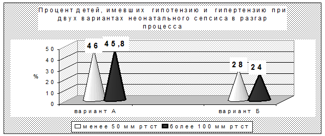 Гипотензия со снижением АД < 50 мм. рт. ст. при А-варианте отмечена у 46% доношенных детей (в 2 раза чаще, чем в Б-варианте). Гипотензия при гиперэргическом варианте развивается рано, однако, требует лишь кратковременной инотропной поддержки. При А варианте она развивалась в более поздние сроки и, при неблагоприятном течении, длилась до летального исхода.